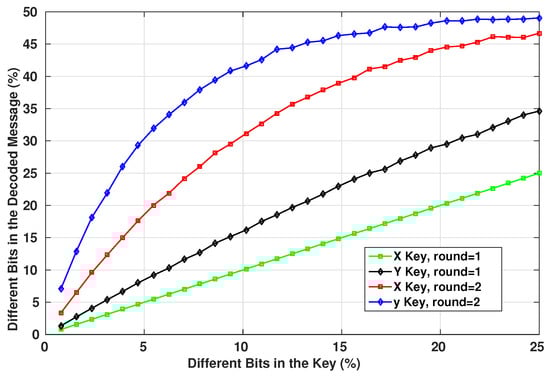 The use of the exact keys is essential to retrieve the original message after receiving the encrypted one. Even though it is only used within an XOR operation, the wrong key will result eventually in an invalid message as the Hash will not match the message. The encryption/decryption system depends on both of the keys generated by the chaotic system, so both of them should be known to be able to decrypt the message. Figure 16 shows the number of bits difference between the decrypted message and the original one when using decryption keys with a given number of wrong bits.