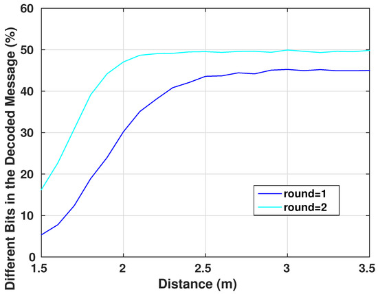 As explained earlier, the communication range of these devices is not more than a meter of coverage. This close area is the normal operational range of any device that needs to communicate with the IMD, whether it is the case of an external wearable device or the doctor’s control device. Any distant communicating device can be asserted as a malicious device. This is where the benefit of using body area network communication appears, essentially that the packets transmitted are generally short in length (128–256 bits). Therefore, a communication in a range shorter than one meter is acceptable. Figure 18 shows how the right packet is hard to recover with an increased distance from the victim. Further, this is in the scenario of possessing a similar encryption/decryption system while having the right keys (that are still hard to intercept as explained through Section 7 and Section 8).