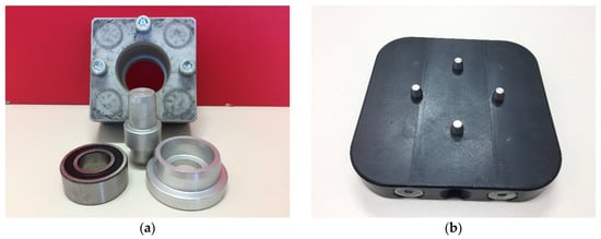 Detail of pieces managed in the FMS: (a) Constituent elements of the turning mechanism; (b) Transport pallet.