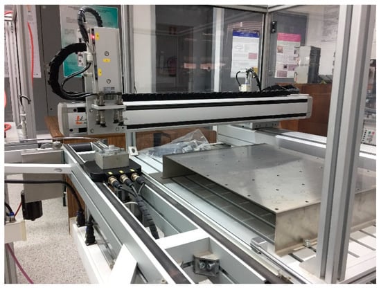 - Station 8 (FMS-208): Automatic warehouse. This station corresponds to an automated warehouse in the X-Y plane of finished parts. The storage of completed sets in a specific coordinate is done by means of two Mitsubishi servomotors that make up a Cartesian XY system (Figure 5). The collection and deposit of the completed set both in the transfer and in its corresponding position in the warehouse are solved through a vertical pneumatic axis (Z axis) equipped with a vacuum pad.