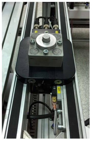- Modular Transfer: All the stations are interconnected by means of a transfer system, consisting of conveyor belts through which the set of pieces moves from one station to another. Consequently, the transport system makes the automatic performance of the process possible. Each of the stations includes an individual transfer section. In this way, multiple combinations of layouts can be developed, with the possibility of joining stations at 90° or 180°. Each individual transfer section includes the retainers and pallet lifters, electrical connections, air vents, and other elements required for its operation. The transfer system incorporates transport pallets in which the pieces are placed so that they can be transported from one station to another, as can be seen in Figure 6, where the aspect of the final piece mounted is appreciated.