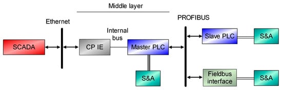 A middle layer composed of a CP and a software-defined structure to store operational data has been developed. On the one hand, the hardware linkage is implemented by a CP module that enables the integration of the master PLC in an Ethernet-based network. On the other hand, an array of Data Blocks (DB) in the master PLC makes the sharing of information between the SCADA and the S&A network independently of their location possible.
