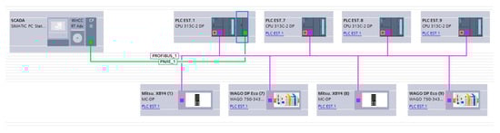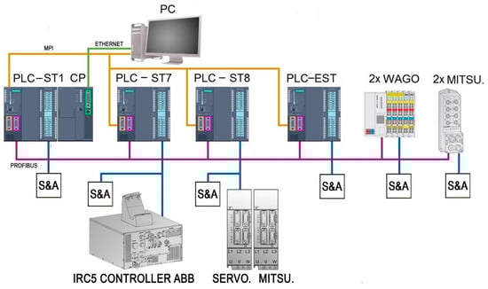 The master PLC communicates with the rest of the components via PROFIBUS. These components are configured as slaves and correspond to the Mitsubishi and Wago distributed I/O modules and the remaining PLC. Eventually, for the initial programming and configuration tasks, the PC could also be connected to the PLC through an MPI connection, as indicated in Figure 9 in an orange color.