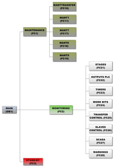 The user program of each of the PLC that make up the automation system is structured in a series of blocks, called Functions (FC). The following diagram shows a flow chart that portrays the structure of the master PLC program (Figure 11).