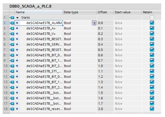 As a sample of this scheme, Figure 13 shows the aspect of the DB designed to exchange Write values between the SCADA system and the PLC of station 8, named DB80, with the master PLC acting as the intermediate layer.