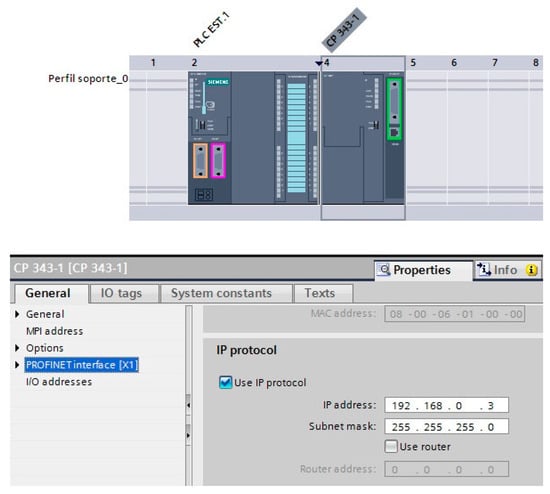 The assignment of the IP addresses is made using the TIA Portal suite. Particularly, the IP address of the CP is defined in the Device configuration menu (Figure 14). The subnet mask must also be specified. Within this menu, the properties of the CP include the parameterization of the PROFINET interface, where the assignment of the IP address is performed. In this regard, it should be noted that this interface allows the use of fieldbus PROFINET or Industrial Ethernet. In the present case, the latter one has been applied as aforementioned. Other configurable features are related to the MPI network, but this connectivity has not been exploited for this application.