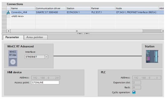 Regarding the MTU, the employed Ethernet interface is a common Peripheral Component Interconnect (PCI) Ethernet card. In WinCC, its IP address in established in an equivalent procedure to that followed for the CP. In addition, for a proper communication MTU–PLC, it is necessary to parameterize a connection within the WinCC, as shown in Figure 15. As can be seen, the addresses of both devices belong to the same range within the LAN.