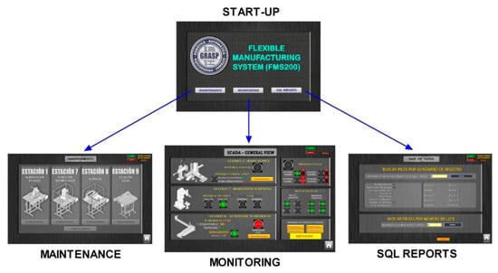 The SCADA system is composed of 14 screens, through which the user can navigate to access all the options and is able to track the process of the FMS. The SCADA system has the following structure: