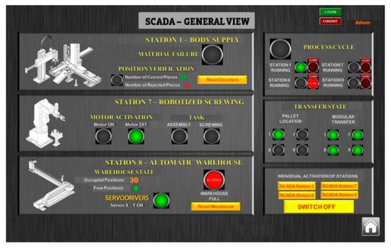 As a proof of concept, Figure 18 shows the main monitoring screen under real operation of the FMS. As can be seen, the working station is indicated in the top right corner, and in the presented case, station 1 is processing body pieces (see the corresponding green indicator). The pallet is placed in this station, which is shown by a green indicator in the section devoted to the transfer state. Concerning the automatic warehouse, an alarm state is reflected, showing that the warehouse is full. The maximum number of stored pieces (30) has been reached, so it is signaled by means of a red LED indicator in order to inform the operator. This human-requesting situation is solved by resetting the counter (button Reset Warehouse) once the positions have been manually released.