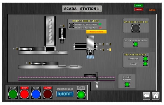 There are also screens to access the monitoring of each station separately. Through animations and Boolean indicators, the evolution of the process can be observed in real time. Other actions that can also be performed are resetting the counters of accepted and rejected parts, restarting the ABB robot system, or resetting the warehouse positions. For instance, Figure 19 shows the screen dedicated to monitor the first station. The reflected case corresponds to that commented on for the previous screen. This one provides illustrative information about the operation of the S&A of the first station. Namely, the pallet is detected, the correct position of the base is verified, and the vacuum pad works properly to place the base over the pallet.