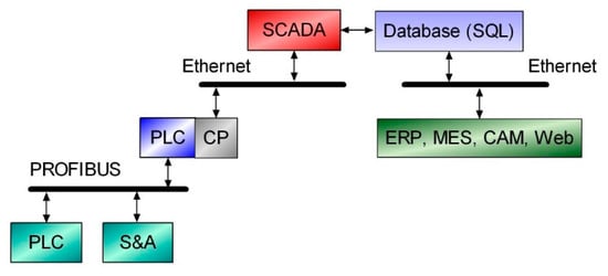 From the point of view of the system operation, there are two network levels in the proposed system, namely: PROFIBUS and Industrial Ethernet (IE). Fieldbus PROFIBUS serves as a communication network among PLC (master and slave units) and distributed Input/Output (I/O) modules. Each of the aforementioned devices includes a communication port for this fieldbus, so, the physical layer of this configuration is already resolved. In this way, the master PLC has access to all the S&A of the manufacturing cell. The communication between the master PLC and the SCADA system is carried out by the standard communication network Ethernet. To this goal, a middle layer that acts as a bridge to link the fieldbus with the SCADA system enables the communication between the master PLC and the SCADA system. Such a middle layer is composed of a Communication Processor (CP) and a software-defined structure to store operational information. Data of S&A are available in the fieldbus through PLC or dedicated interfaces. There are also S&A linked directly to the PLC of station 1.