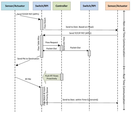 - Schneider, B.; Zoitl, A.; Wenger, M.; Blech, J.O. Evaluating Software-Defined Networking for Deterministic Communication in Distributed Industrial Automation Systems. In Proceedings of the 2017 22nd IEEE International Conference on Emerging Technologies and Factory Automation (ETFA), Limassol, Cyprus, 12–15 September 2017. [Google Scholar]
