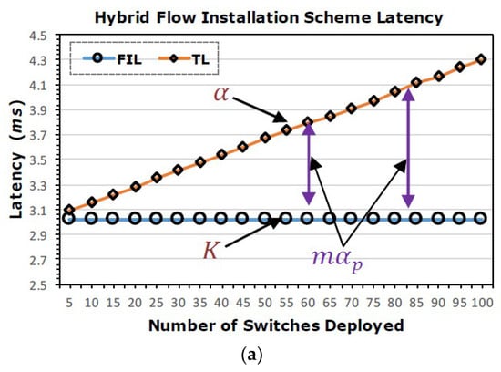 To see the implication of Lemma 2, we repeat the simulation with the number of switches varying between (). After performing all the Monte Carlo simulation runs, we average the results obtained for each value of S as shown in Figure 6. Figure 6a shows that with HFIS, the total flow installation latency is constant irrespective of the network size; therefore, the total latency is directly proportional to . Figure 6b presents the latency for RFIS. In the worst-case scenario for RFIS, each switch in a route could have packet flow table miss with the associated flow setup cost. Therefore, the total latency is dominated by the flow installation overhead (, ). The PFIS latency results are shown in Figure 6c. Since the respective flow is installed across all switches before the arrival of any data packet, there is no table miss. As in the HFIS case is directly proportional to with and .