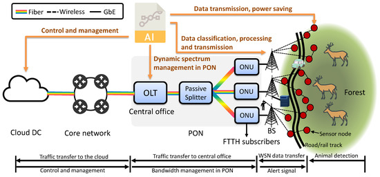 In Figure 1, wireless sensor nodes (edge devices) form an aggregation network along the road (e.g., to mimic a point of human-animal conflict) and they are wirelessly connected with the so-called sinks, denoted as base stations (BSs). Whenever a WSN node detects animals’ presence, it tries to send sensed data (e.g., picture/video) of its surroundings to a nearest BS. The energy aspect is also relevant for systems that are not connected with power grid and are, for example, either battery-based, or solar-powered. Another advantage of AI techniques is that they could also relieve the network congestion by avoiding the unnecessary data transfers, which also improves the end-to-end delay of those transfers that need to go over the network. On the other hand, a limited processing and storage resource pool at sensors would also have negative impact on the accuracy of classification and prediction. In contrast, a cloud-based infrastructure connected to the ONUs could deduce information from the animals’ raw data with more accuracy in classification and prediction. This makes it interesting to investigate the role and placement of AI-based methods in animal welfare and human-animal cohabitation systems based on FiWi.