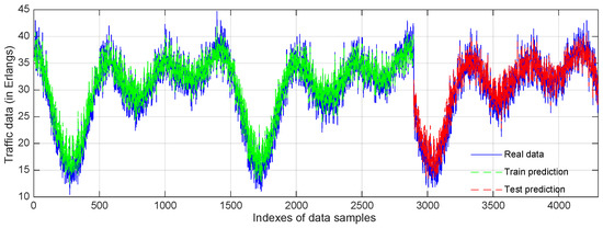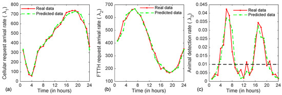 Real traffic vs. predicted traffic of three classes of services, namely cellular, FTTH and animal are shown in (a–c), respectively.