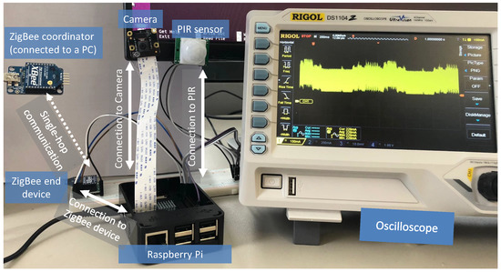 The experimental setup is shown in Figure 3. A R-Pi 3 (model B) as an end device is connected to a passive infrared (PIR) sensor to detect the movement of animals, and the PIR sensor is used to wake up a 5 megapixel (MP) camera module to capture images of animals. Additionally, we utilize a low-power ZigBee communication protocol to transfer data between an end device and a server (PC) without any packet retransmission. For which, we use two XBee transceiver modules, one is configured as an end device and connected to the R-Pi, and another is configured as a coordinator and it is connected to the server situated a few meters apart. Since the R-Pi can process images with the help of a convolutional neural network (CNN) image classification algorithm, we evaluate two scenarios: (i) capture-transfer, and (ii) capture-process-transfer. The capture-transfer scenario captures an image at the end device and then transfers its binary data to the server. On the other hand, the latter scenario captures an image, processes it to detect whether animals are present or not and their types, and finally the end device transfers a message about the animals’ presence in its vicinity. For the image processing and classification on the R-Pi, we install a pre-trained CNN model (trained on a PC) using a TensorFlow framework [25] which is widely used in the community on the R-Pi. The experimental setup to measure the current drawn during the operation of the two scenarios is shown in Figure 3. We use an oscilloscope to measure the amount of current drawn by the R-Pi module. The current is measured from the voltage drop across a very low shunt resistor (1 Ohm), which is connected in series to the R-Pi module.