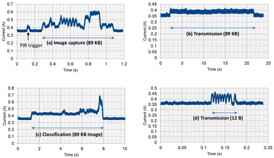 Average drawn current in: (a) capturing an 89 Killo bytes (KB) image; (b) transmission of 89 KB image; (c) classification of the same captured image (89 KB); (d) transmission of processed data of size 12 bytes.