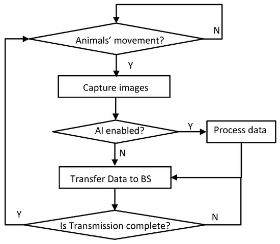 A program flow chart for animal detection, and data processing and transmission.