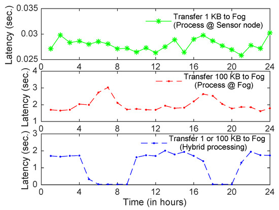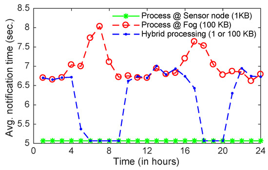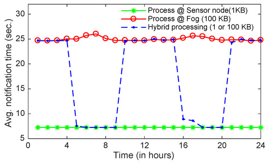 Figure 9 shows the approximate average notification time, which is the average value of the time difference between the arrival of an animal detection event and an alert message disbursed to the passing vehicles/humans. The notification time is calculated as the sum of the data transmission time, the average packet latency and the processing time. We ignore the latency in disbursing alert messages from BSs to passing vehicles, since it is negligible as compared to other latencies and remains same in all three scenarios compared here. Furthermore, we assume that processing times at sensors and BSs are 5 s and 1 s, respectively. ZigBee transmits 100 bytes data per packet at a maximum rate of 250 Kbit/s, thus the total transmission times of 1KB (10 packets) and 100 KB (1000 packets) data are approximately 0.04 s and 4 s, respectively. As can be seen in Figure 9, the notification time in the second scenario (i.e., processing at fog and 100 KB data transmission) varies from 6.5 s to 8 s as compare to the first scenario (processing at sensors and transferring just relevant information 1 KB), which is around 5 s. It should be noted that even though the processing time at the edge layer (5 s) is selected four times longer than that of the fog layer (1 s), it is beneficial to process data at the edge layer and transfer only relevant data to higher layers during the peak hours (dawn and dusk) as done in the hybrid processing, especially in WSNs with low power communication protocol (e.g., ZigBee), since the packet latency and the transmission time are the main contributors in the notification time.