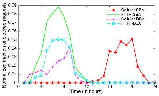 Fraction of blocked requests of cellular and FTTH traffic.