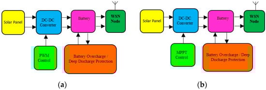 Block diagram of solar energy harvesting system using PWM and MPPT control. (a) Using PWM control; (b) using MPPT control.