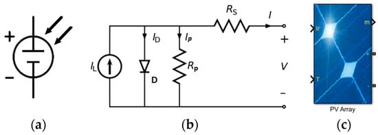 where, I = total output current of solar cell, IL = Light generated current by the solar cell, Io = Reverse Saturation current due to recombination, q = charge of electron (1.6 × 10−19 C), V = open circuit voltage of solar cell, k = Boltzmann’s constant (1.38 × 10−23 J/K), T = Temperature of Solar cell (300 K). The symbol of the solar cell is shown in Figure 3a. The solar cell equivalent circuit model can be represented as shown in Figure 3b. It consists of a light generated current source (IL), a diode (D) modeled by Shockley equation, and two series and parallel resistances. A MATLAB Simulink model for a solar panel is shown in Figure 3c. In Figure 3b, Kirchhoff’s current law (KCL) can give the characteristic current equation for this equivalent circuit: