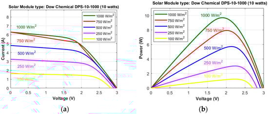 Solar Panel characteristics with variations in Irradiance level (Watts/m2). (a) I–V Characteristics; (b) P–V Characteristics.