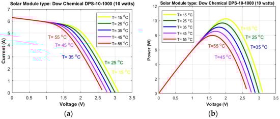 Solar Panel characteristics with variations in Temperature (oC). (a) I–V Characteristics; (b) P–V Characteristics.