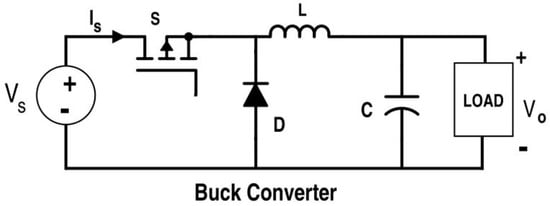 There are generally three types of DC-DC converters [15] used in the design of a photovoltaic system: Buck Converter, Boost Converter, and Buck-Boost Converter. Here, we have used a DC-DC Buck converter because its efficiency is high as compared to Boost and Buck-Boost converters. A DC-DC buck converter is a power electronics converter in which the output voltage is always less than the input voltage. The Buck converter consists of a DC voltage source (Vdc), an inductor (L), a switch (MOSFET), a diode (D) and a capacitor (C) as shown in Figure 6. When MOSFET switch (S) is closed at time t1, the input voltage Vs appears across the load resistor. If the MOSFET switch remains OFF for the time t2, then the voltage across the load resistor is zero. The amplitude of output voltage (V0) is less than the input voltage Vo. The Duty Cycle (D) can be varied from 0 to 1 by varying time period t1. The duty cycle of the Buck converter is D = Vo/Vin. The average output voltage of the buck converter is given as: