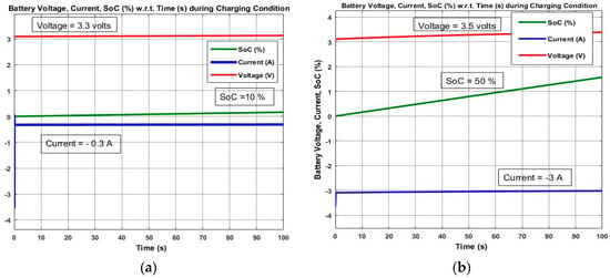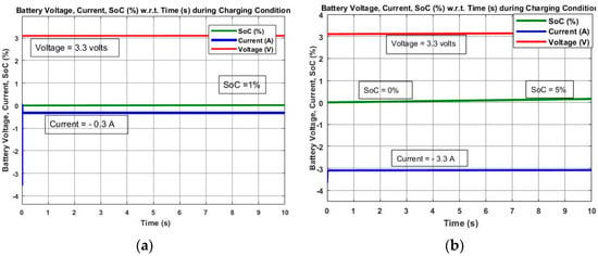 Simulation results of PWM controlled and P&O MPPT controlled solar SEH system for 100 s. (a) Battery SoC, Voltage and Current during Charging using PWM control; (b) Battery SoC, Voltage and Current during Charging using P&O MPPT control.