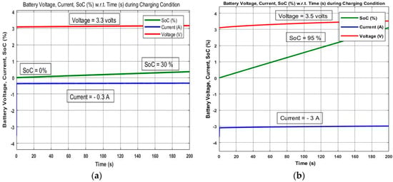 Simulation results of PWM controlled and P&O MPPT controlled solar SEH system for 200 s. (a) Battery SoC, Voltage and Current during Charging using PWM control; (b) Battery SoC, Voltage and Current during Charging using P&O MPPT control.