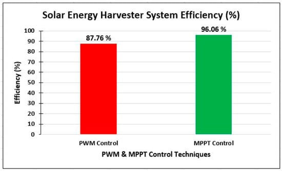 The energy harvester system efficiency is calculated for PWM control and MPPT control methods separately as: