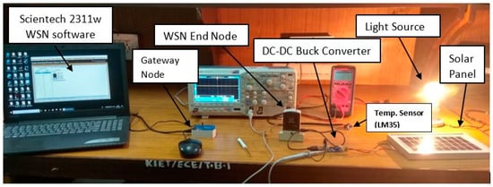 A hardware experiment for the SEH-WSN scenario is performed to monitor the room temperature wirelessly using a highly efficient of energy harvester system as shown in Figure 14. The complete SEH-WSN system is divided into two parts i.e., WSN system and an Energy harvesting system. The Scientech Technologies Private Limited, (New Delhi, India) made WSN trainer kit (Scientech 3211) is used for the WSN system and a commercial Buck converter (LM2575, Texas Instruments Inc., Dallas, TX, USA) with a solar panel is used for the solar energy harvesting system.
