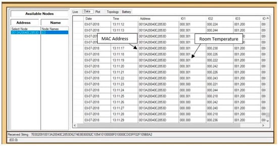 The measured room temperature is 0.301 × 100 = 30.1 degree Celsius, as shown in the Scientech 2311 WSN monitoring software in Figure 15. The MAC address of the end WSN node is also shown with the actual date (3 July 2018) and time (13:11:12 p.m.) of the reporting of the WSN end node to the gateway node.
