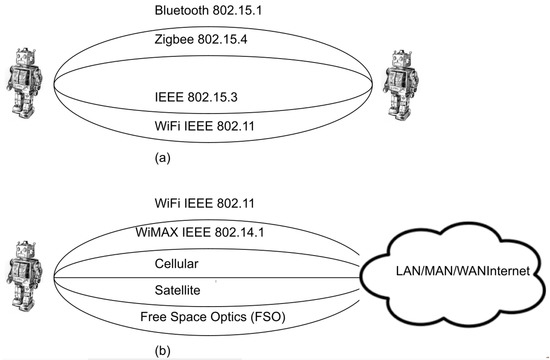 Since robots are mobile during a significant portion of their operational time, they constitute a specific type of mobile ad hoc networks (MANETs). Certain protocols that are appropriate for MANETs can be used at the various layers of the open system architecture (OSI) model. These layers include the physical, data link, network, transport, and application layers (The session and presentation layers are commonly merged with the application layer).