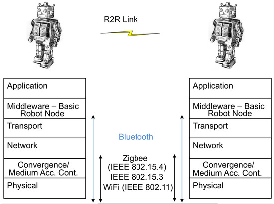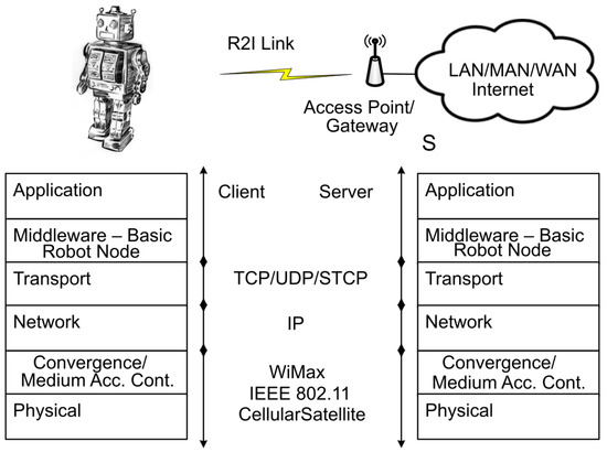 The networking layers at the nodes using R2R and R2I communication are shown in Figure 3 and Figure 4 respectively. In Figure 3, the two nodes are either two BR, or a basic robot and a gateway robot. In Figure 4, the nodes consist of a gateway robot on one side and an access point (AP) to the infrastructure (or backbone) network and/or the Internet on the other side. In the first case (R2R communication), the shorter to medium range wireless protocols can be used. Such protocols include IEEE 802.15.4 (Zigbee), IEEE 802.11 a/b/g/n/ac (Wi-Fi), and IEEE 802.15.1 (Bluetooth). The first two cover the physical and data link layers, and Bluetooth covers the same layers as well as the network and transport layers. These protocols are also characterized with relatively lower energy consumption. In the second case (R2I communication), the medium to longer range wireless protocols can be used. Such protocols include IEEE 802.11 a/b/g/n/ac (Wi-Fi), IEEE 802.16 (WiMAX), Cellular, and Satellite. Above the underlying network protocols resides the Internet Protocol (IP) protocol at the network layer, the Transmission Control Protocol (TCP), User Datagram Protocol (UPD), or Stream Control Transmission Protocol (SCTP) at the transport layer. These protocols are followed by the middleware layer, and the appropriate client and server protocols at the application layer.