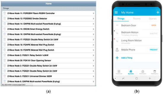 The usability of a system—how easily users can interact with a system—is also one of the important factors to expand an IoT ecosystem. However, methods to improve the usability of IoT platforms/systems have not been intensively studied. Recent commercial IoT platforms/systems such as IBM Watson IoT Platform [5], Thing+ [6], Amazon Web Services (AWS) IoT [7], OpenHAB [8], and Samsung SmartThings [9] and ARTIK [10] platform provide an interface to manage, monitor, and control a set of buildings, locations, devices through their mobile or web-based applications. Figure 1a depicts a web-based interface to show a list of installed devices supported by OpenHAB [8]. The list in Figure 1 shows that there are approximately 20 devices installed in “Home”, some of which are sensors and the rest are actuators. However, it is not intuitive for users to recognize the name, type, and installed location of each IoT device owing to the inefficient design of its web application interface. Figure 1b is a mobile interface provided by SmartThings [9], which provides a simple list-based interface to show a set of installed devices. Even with a mobile application, it is obvious that the usability of an IoT platform will drastically decrease as the number of installed devices increases because users cannot easily choose the IoT device they want to observe and manipulate.