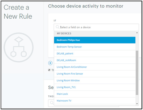 Furthermore, the recent advances in IoT ecosystem enables the interoperability between users, processes, data, and devices, which results in the increasing needs of more complex IoT scenarios such as “Turn off all lights when nobody is at home” or “If a room is cold, turn on the air-conditioner to warm up”. To handle such a complex query, several commercial IoT platforms and previous studies have tried to develop an efficient rule-engine or data structure for IoT environment [11,12,13,14] and to provide rule-based application services through their web or mobile interfaces [7,9]. However, the previous works focused on introducing the functionality but failed to consider the usability when designing an interface for composing IoT rules between smart objects, such as sensors, actuators, and applications. With a list or grid-type interfaces, it is still difficult to find and select an appropriate object to be used for the condition and action components of IoT rules if the number of installed devices is large. Figure 2 shows a web interface for the rule composition of ARTIK Cloud which supports a simple list-based view. In this design, users need to scroll up and down to locate a target device to use, which is inconvenient and time-consuming.