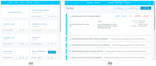 The aforementioned studies [16,17,18,19], however, still focused on the efficient management and interaction of smart objects (i.e., sensors and actuators) rather than interaction between users and IoT services. The platforms and systems presented by [20,21,22,23,24] suggest various approaches to provide IoT services by taking the interaction between users and devices into account. Ref. [20,21] proposed an IoT-based smart home automation and monitoring system. Various sensor and actuator nodes are configured with microcomputers like Raspberry Pi and Arduino and then installed in a home. The collected data are transmitted to a cloud server and subsequently processed according to the user’s requests. However, these works also suffer from the limitations that a simple list-style interface can have. Memedi et al. [22] presented an IoT-based system for better management of Parkinson disease by giving patients insights into symptom and medication information through mobile interfaces. In particular, the mobile interface was designed according to the usability heuristics for the elderly, such as text size, color and contrast, navigation and location, mouse use, and page organization. Similarly, Wu et al. [23] and Hong et al. [24] proposed a GUI-based application to monitor the status of sensor nodes in a safety and health domain. However, ref. [23] does not support a manual or rule-based actuation features; therefore, its usefulness is limited. In particular, since [24] depends on the ARTIK cloud as its cloud backend, the aforementioned problems and limitations of ARTIK cloud interface still exist. On the other hand, Zhao et al. [25] and Heikkinen et al. Ref. [26] proposed methodologies and architectural frameworks to build and support time-critical applications in a cloud environment.