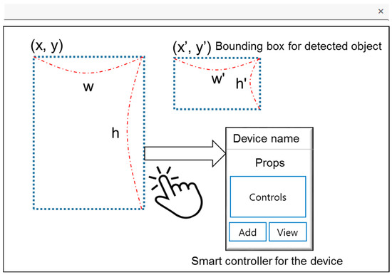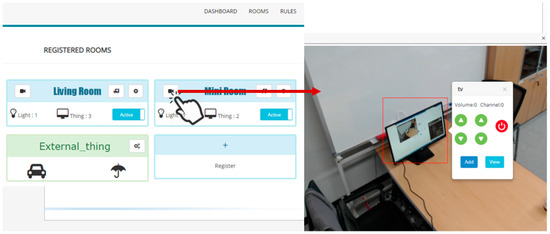 Figure 6 shows how the proposed system works. To observe the indoor status of a room, users can interact with a visual interface in which video streams captured from a smart camera are displayed. In the visual interface, users can immediately locate an IoT device recognized by the system and subsequently use a smart controller (a white rectangle with buttons shown in Figure 6) to check the details of the device or to perform operations that are supported by the device (e.g., turn on/off, volume up/down, etc.). The smart controller for each device appears when a user clicks or touches the identified device on the video stream view, which means a user does not need to scroll up and down to locate a target device. In addition, users can add a new IoT rule for the device or view a list of IoT rules regarding the selected device by touching the rule-related buttons attached at the bottom of a smart controller. Therefore, the goal of the proposed system design is to improve the usability and efficiency of the existing IoT platform interfaces.