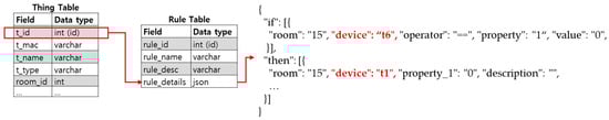 To prepare rule-related data for the selected IoT device, the platform server sends a query to the rule table which is composed of rule details and interacts with an IoT rule engine. In this work, the authors’ previous work [28] is used as an IoT rule engine for the IoT platform server. The rule engine is based on the open-source RETE-based rule engine framework called Nools [36] where “condition” component and “actions” component form a single rule item. For persistence, the rules composed in the IoT rule engine are converted to a JSON-formatted string and stored in the rule database of the IoT platform server. Figure 13 shows an example of the IoT rule stored in the rule table. As can be seen, a rule consists of “if” clause and “then” clause which define a target room, device, operator, properties and values.