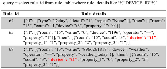 Adding a new IoT rule regarding the selected device through a smart controller is straightforward. Once a user clicks the “Add rule” button on the controller, the platform server just uses the device ID for rendering interfaces for adding new rules for a specific device. To view a list of rules regarding the selected device, the platform server needs to have a set of rule IDs containing the ID of the selected device. For this, the platform server investigates the rule_details field of each rule item in the rule table to check if the ID of the selected device is included or not. Figure 14 shows an example of getting the list of rules regarding a certain device ID. The example database query is designed to check if each IoT rule contains the target device ID in its details. For example, if the target device ID is set to “t1”, then rule ID 65 and 68 are returned as a result. Finally, a set of rule IDs can be passed to the web interface for rendering a list of rules regarding the selected devices. The other components of the rule_details field are related to Nools rule engine syntax. Details about the Nools rule engine or the authors’ previous rule engine can be found in [28].