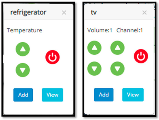 Figure 15 presents a template of the proposed web interface. The dashed boxes indicate bounding boxes for the detected IoT devices. According to the coordinates data passed from the vision server, the web interface adds each of the bounding boxes on the video stream view. The bounding boxes only have a click event handler to open a smart controller and they are not visualized on the video view when initialized. If a user clicks the area of a bounding box, its corresponding smart controller appears on the view. The solid line box of Figure 15 represents the template for a smart controller and Figure 16 depicts the rendered smart controllers for refrigerator and TV device types. The buttons for device properties and operations are rendered according to the specifications retrieved during the device configuration step. Finally, the web interface for rule composition (i.e., adding a new rule or viewing a list) is also rendered according to the device ID delivered from the IoT platform server.