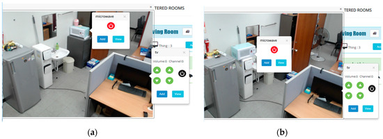 Figure 17 depicts a web interface where the video stream of a room is open and the smart controllers for a microwave and TV are activated. It is shown that the UI of a smart controller is rendered according to the type of the selected device. For example, a microwave only has a binarySwitch operation (i.e., turn on/off), thus only a power button is located in the smart controller for the microwave. On the other hand, a TV has three properties: binarySwitch, audioControl, and channelControl. Therefore, the smart controller for a TV consists of three different kinds of button groups. Figure 17 also shows that the proposed system can successfully track and recognize an IoT device even though its location is changed. For example, the smart controller for the microwave is successfully activated even though its location is changed.