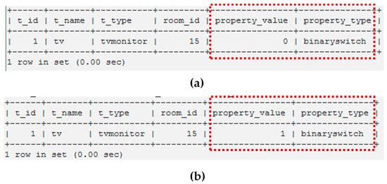 With a smart controller, a user can directly manipulate the status of the selected device by touching the buttons. For example, if a user touches the power button in the smart controller, the IoT command for the selected device is generated according to the power status of the device and subsequently sent to the target device by the IoT handler in the platform server. After receiving an acknowledgment message from the target device, the platform server updates the thing table to store the status of the device. Figure 18 shows how the thing table is updated after the power button is pressed. The value of the binarySwitch field has been changed from 0 (off) to 1 (on).