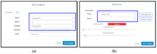 The “add” and “view” buttons in the smart controller can be used for composing new IoT rules or viewing a list of IoT rules regarding the selected device. Compared to the previous approaches for IoT rule composition, the proposed system helps users intuitively locate a target device to be used for rule composition. When composing a condition or an action component of a rule, the ID of the selected device and its default field are automatically set for quick manipulation. Figure 19 shows an example of the interface for setting conditions to compose a new rule with the proposed system. As depicted in Figure 19a, the input fields for a room, device, and its attributes for the condition part are automatically set according to the device ID that a user selects. Similarly, the input fields for a room, device, and its available operations and properties for the action part are accordingly set and rendered. On the other hand, users can easily search for a list of IoT rules related to the selected device using the smart controller. For example, Figure 20 presents a list of IoT rules related to the selected TV device. Because the search operation for IoT rules is performed based on the device ID, only the IoT rules for a specific device can be returned to the users.