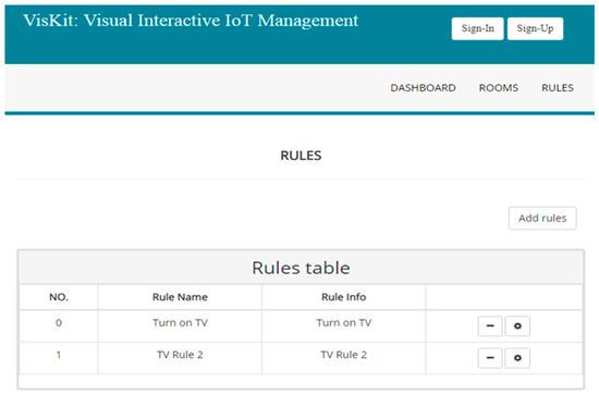 The recent IoT platforms including ARTIK, AWS IoT, and IBM Watson IoT tried to provide a GUI-based web application for device and rule management as presented in Figure 3. As stated in Introduction, however, the current web-based GUI applications of commercial IoT platforms did not consider the usability; hence, it is not intuitive and efficient for users to manage the IoT devices and rules. For example, ARTIK cloud web application’s device management interface shown in Figure 3a just provides a long list of installed devices, each of which displays a name, type, and some buttons. If the number of installed devices becomes large, the users are required to spend much more time to locate their target devices. Figure 3b also presents a web interface for rule management of the ARTIK cloud. Similar to the device management interface, the rule management interface also provides a list of generated rules, each of which displays a name, descriptions of rule components based on the ARTIK cloud rule syntax. Therefore, it is obvious that the users have to spend much more time as the number of devices increases and the type varies.