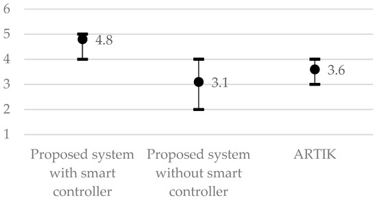 Finally, we conducted a survey on user satisfaction about the usability of the system with the Likert-5 scale (i.e., 1: Very unsatisfactory, 4: Very satisfactory). As shown in Figure 21, the proposed system with the smart controller achieved the best scores among the systems considered. However, the proposed system without smart controllers achieved a lesser score (i.e., 3.1) than the ARTIK platform (i.e., 3.6). This result came from the fact that the ARTIK platform has a more fancy and professional interface than the proposed system. It was found that the users preferred a system with a better interface if there were no significant differences in performance between the systems.
