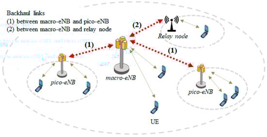 Heterogeneous networks (HetNets) are another solution of denser infrastructures in which small- or pico-cells with low-power eNBs are installed within the coverage area of a macro-cell [12,13,14,15,16]. The objective of HetNet is to allow the UE to access pico-cells that overlap within a geographical coverage area even when the UE is within the coverage of a donor macro-cell. In other words, when the traffic in the donor macro-cell increases, its UE can access the pico-cells automatically. Through this mechanism, HetNet can increase system capacity, particularly when there is the heavy traffic in the macro-cell.