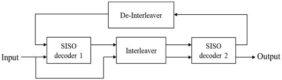 Figure 3 shows a block diagram of the turbo encoder (coding rate = 1/3), which uses two identical convolutional encoders (1st and 2nd encoders) with a constraint length of four and one internal interleaver. Figure 4 shows a block diagram of the soft-decision Viterbi decoder, which comprises two single soft-in soft-out (SISO) decoders that work iteratively, with the output of the first decoder (SISO decoder 1) feeding into the second decoder (SISO decoder 2) to form a turbo decoding iteration. During this process, interleaver and de-interleaver blocks re-order the data [28,29].